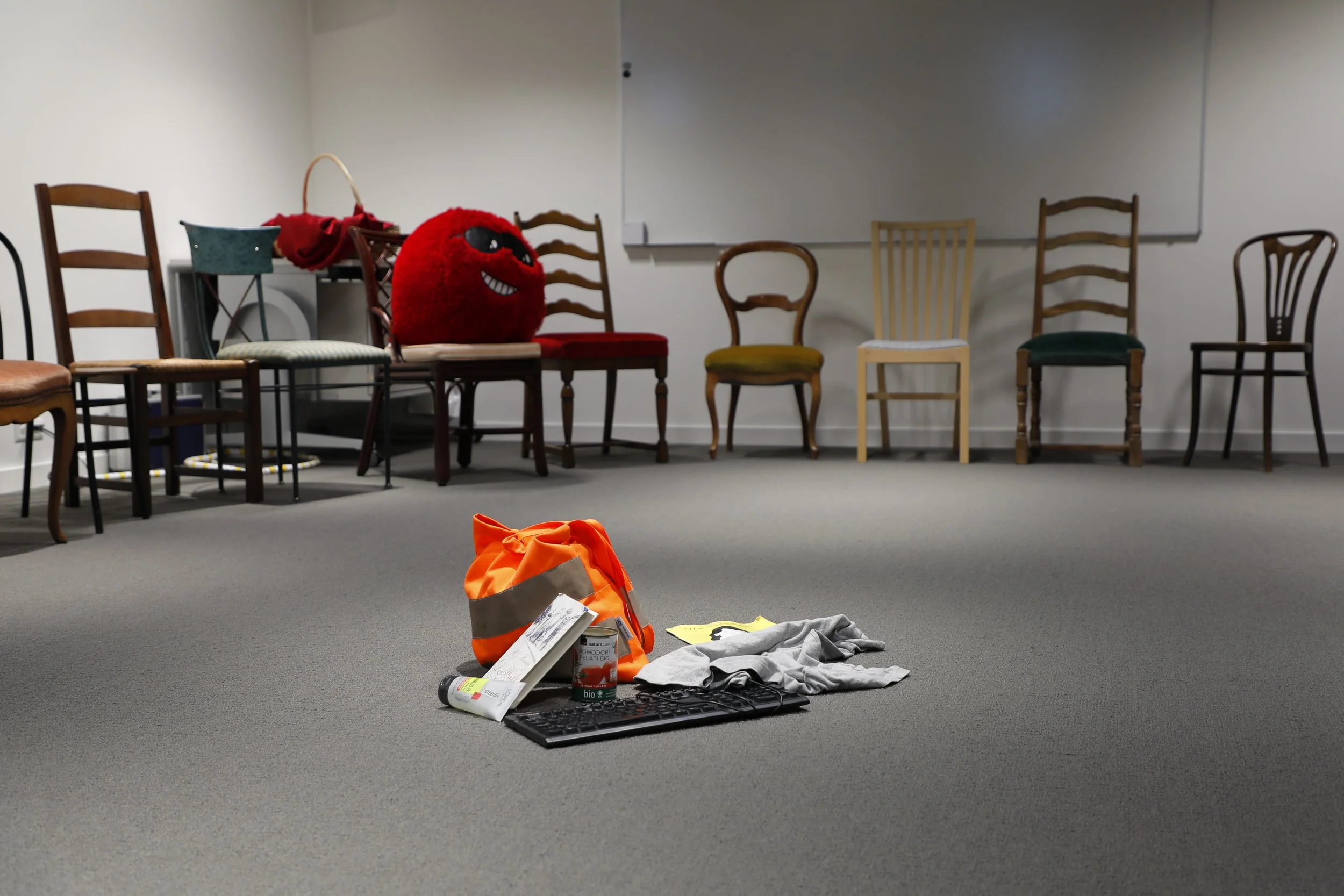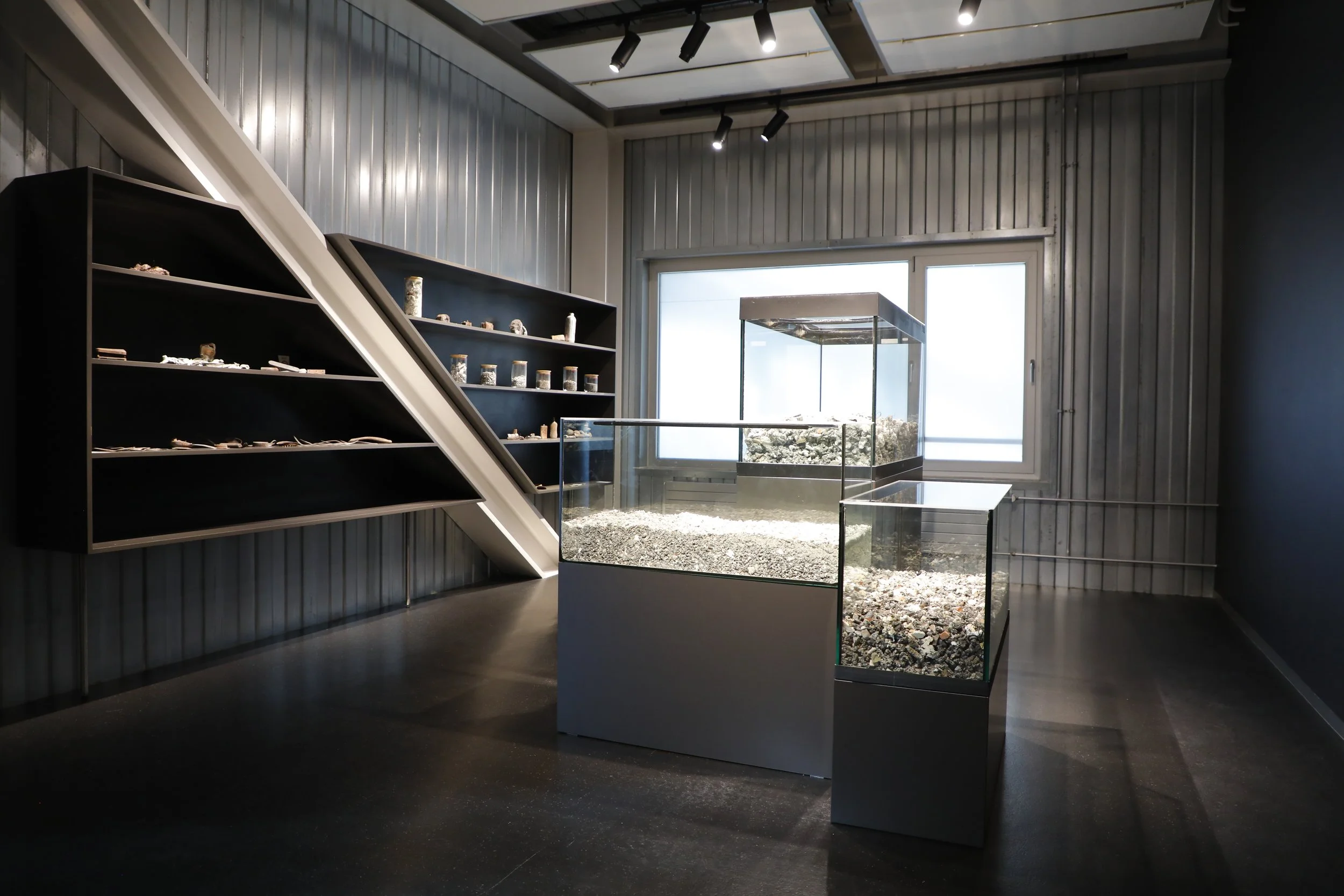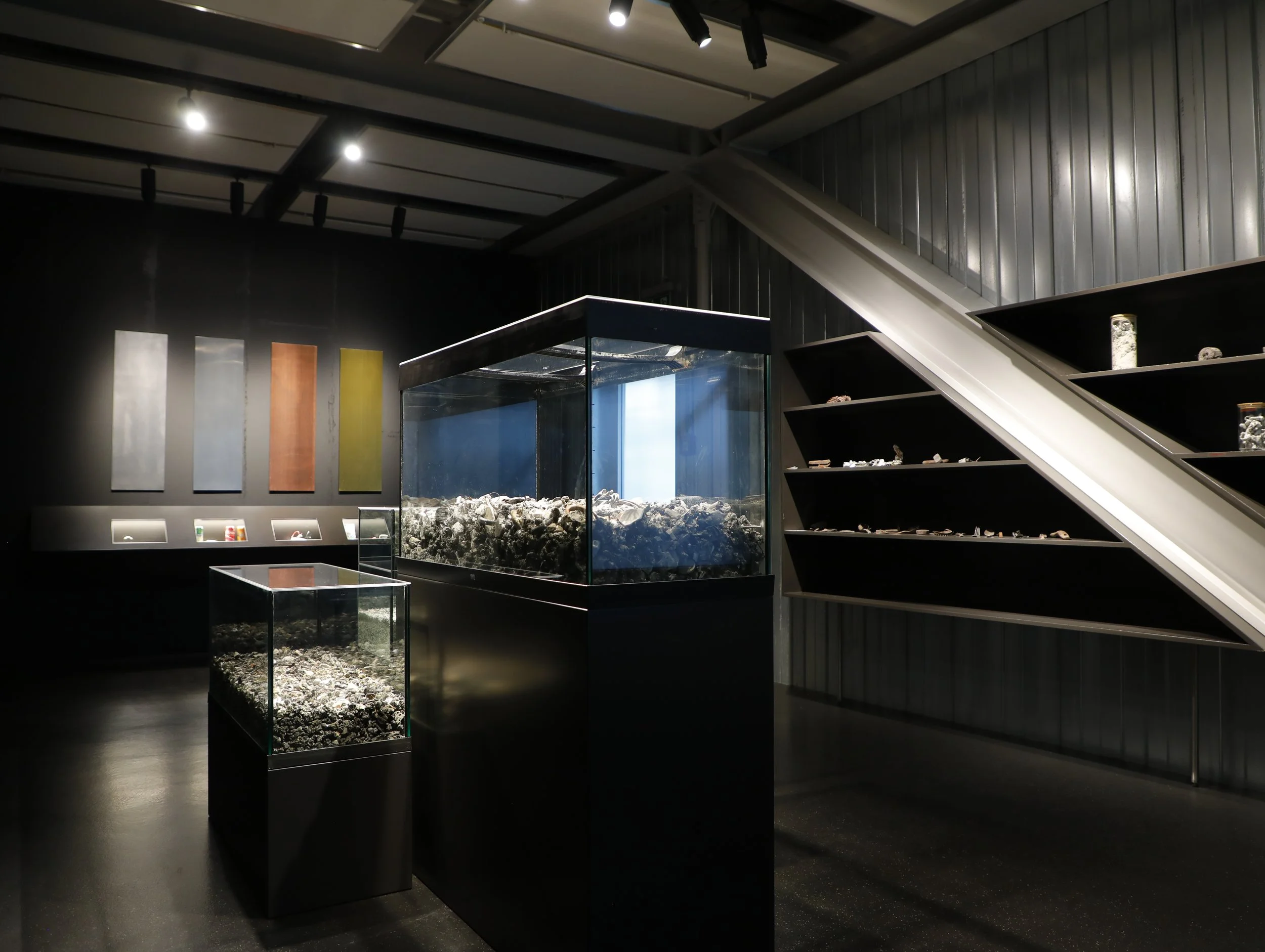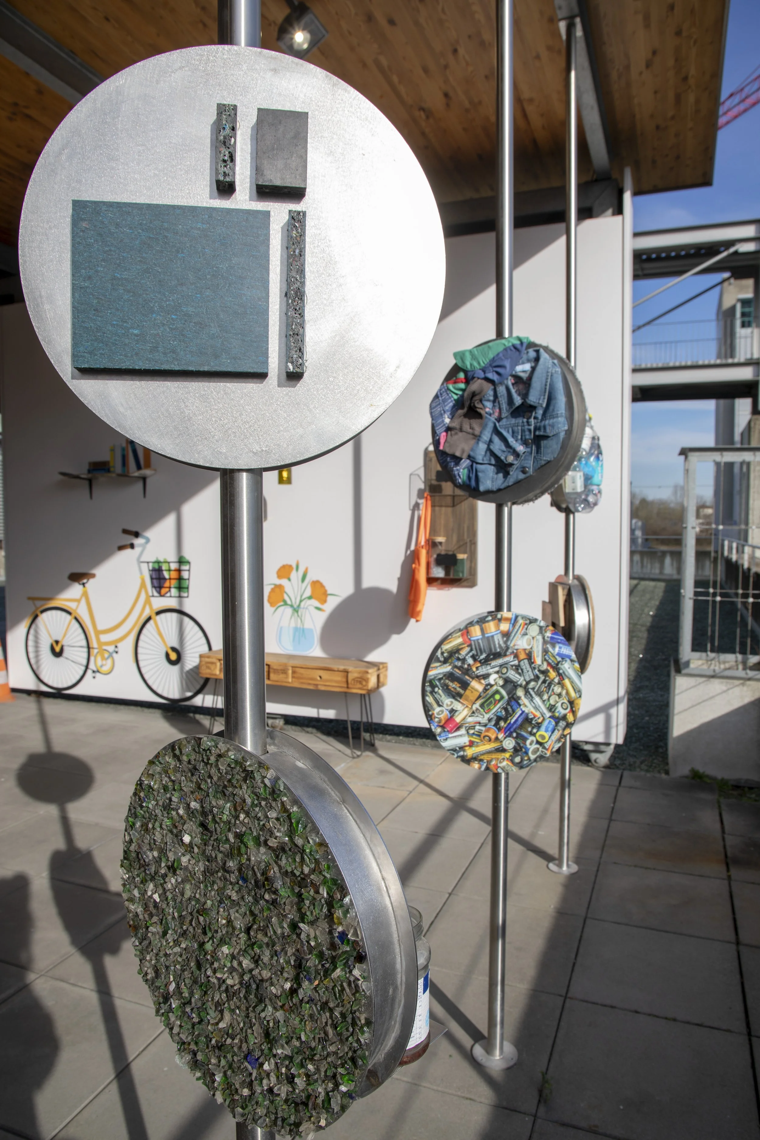 Stühle aus dem hauseigenen Recyclinghof fanden ebenso neue Verwendung wie alte Aquarien, die nun als elegante Vitrinen Schlacke zeigen – also verbrannten Abfall