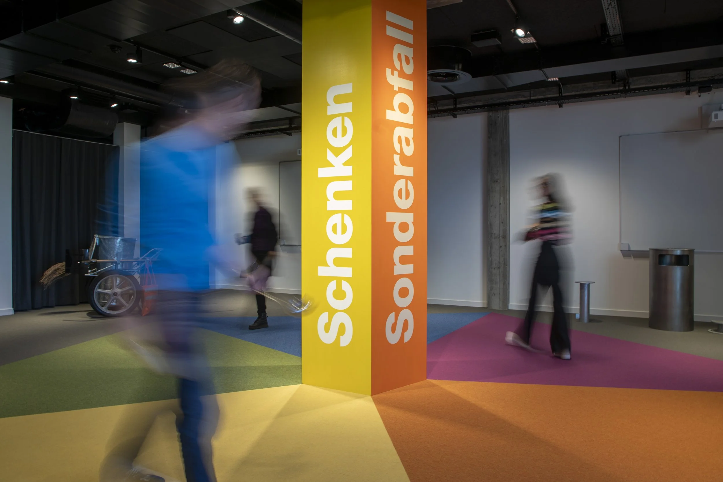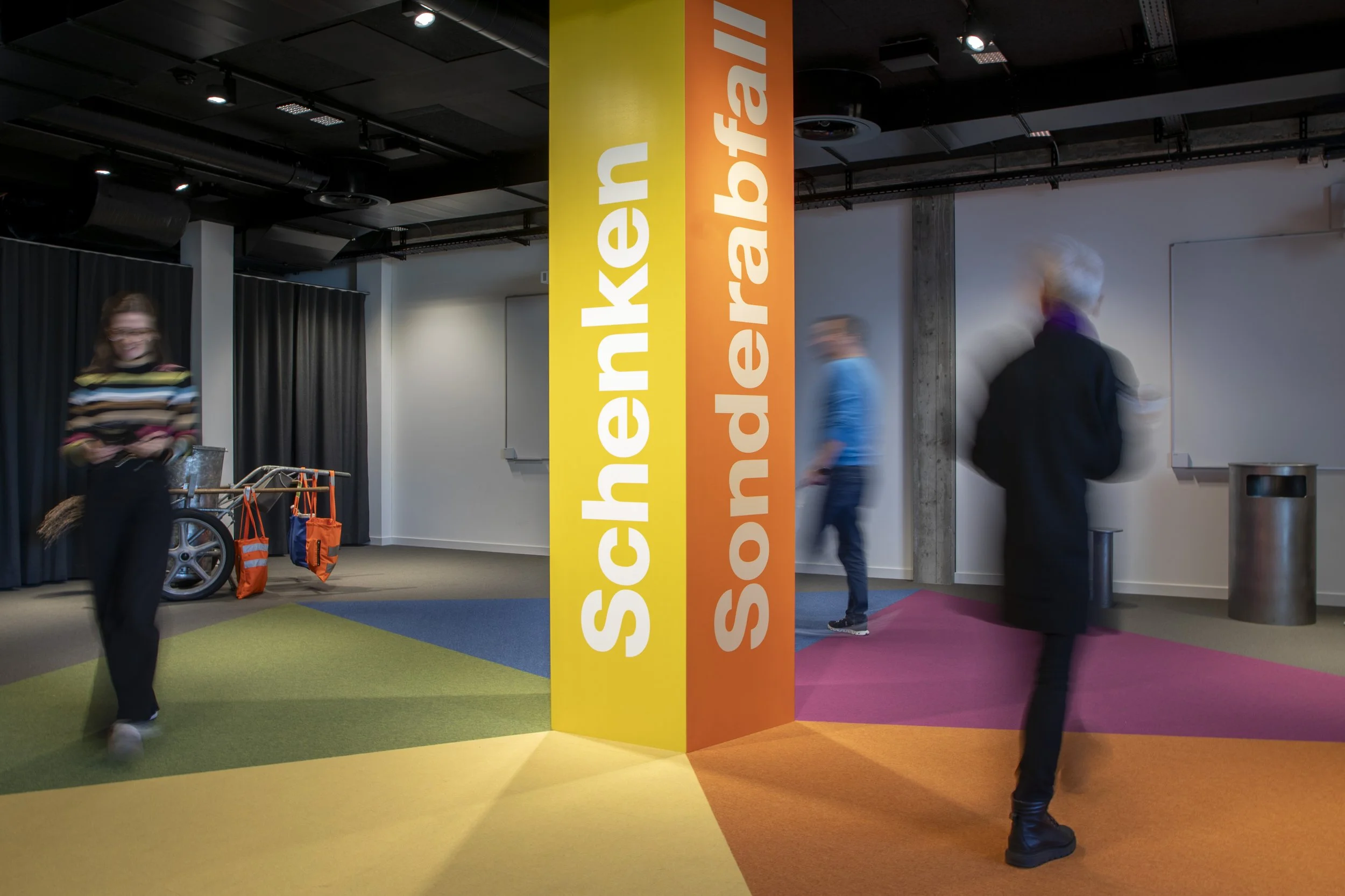 Durch klare, einfache szenografische Eingriffe wurde eine neue Atmosphäre geschaffen. Die Räume überzeugen durch ein schlichtes, farbiges und elegantes Design – und durch ein Konzept, das Recycling nicht nur thematisiert, sondern auch in der Ausführung sichtbar macht:
